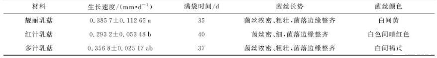 从表1可知,在相同母种培养基中,靓丽乳菇生长速度最快,日均生长量为1.13 mm,红汁乳菇菌丝的生长速度相对较慢,靓丽乳菇与红汁乳菇菌丝的生长速度达显著差异;多汁乳菇菌丝的生长速度与靓丽乳菇和红汁乳菇无显著差异。
