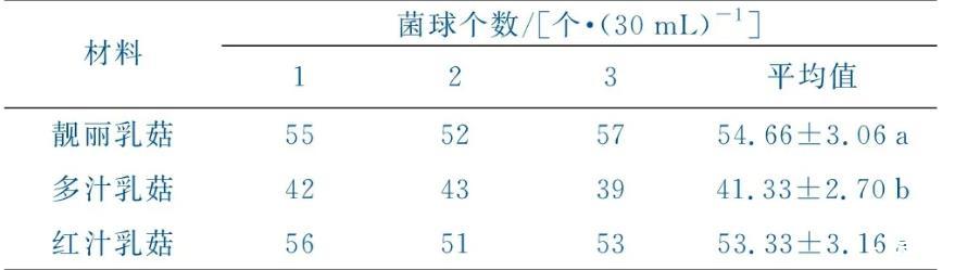 从表2可以看出,在摇床培养相同时间的每30 mL液体培养基中,靓丽乳菇在液体培养基中的菌球数量最多,平均达54.7个·(30 mL)-1,红汁乳菇次之,靓丽乳菇与红汁乳菇在液体培养基中的菌球数差异不显著,多汁乳菇在液体培养基中的菌球最少,平均41个·(30 mL)-1,并与靓丽乳菇和红汁乳菇在液体培养基中的菌球数达显著差异。