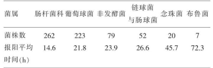 报阳时间656例报阳标本中,肠杆菌科的细菌262例,占40%;葡萄球菌223株,占34%;非发酵菌79株,占12%;链球菌52株,占8%;念珠菌20株,占3%;布鲁菌7株,占1%;假阳性13株,占2%。其报阳时间见表1。