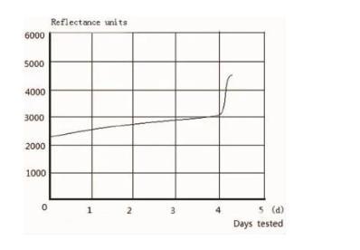 肠杆菌科报阳时间最短,而生长曲线的迟缓期短,对数期十分迅速,平稳期极短,有时甚至看不到并且其二氧化碳的绝对浓度都在4000反射光度以上。其形成上述特点是由于此类细菌一般为兼性厌氧,在对营养条件要求不高,生长期短,细菌繁殖快,发酵葡萄糖产酸且产气,二氧化碳产生速度快而量多[3]。这些报阳的肠杆菌科细菌中有一例特别的生长曲线见图二,虽然这例五天报阳时间,但是其对数期十分迅速。出现这种生长曲线的原因是患者在抽血培养前就使用过抗生素。