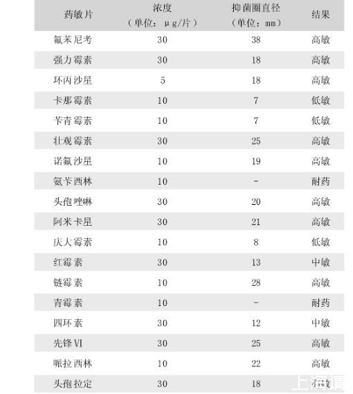 蘸取分离菌的肉汤培养物,接种于血琼脂平板,将各种药敏纸片分别平贴于培养基表面,37℃培养24h,测定抑菌环。