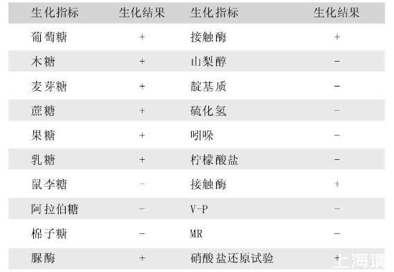用分离菌纯培养物进行下列试验:硝酸盐还原、尿素酶、靛基质、MR、VP试验、葡萄糖、乳糖、硫化氢、接触酶、水杨苷、麦芽糖、蔗糖、甘露醇、果糖、木糖、柠檬酸盐、山梨醇等糖发酵试验[3]。接种前在发酵管中加入2μL的1%的NAD。