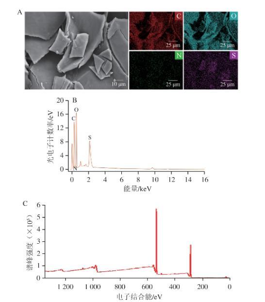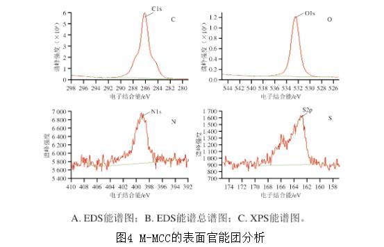 为了进一步了解M-MCC的元素分布情况,采用SEM-EDS和XPS分别对C、O、N、S进行元素分析。M-MCC中的元素分布情况如图4A所示,包含C、O、N、S的EDS总谱图如图4B所示,可以看出,在M-MCC上可以检测到N、S元素,而这两种元素MCC本身不具备,由于L-Met接枝负载在MCC上而出现,这证明L-Met成功接枝到了MCC上。在能谱总谱图中能够观察到N、S的特征峰,也证明了这一结论。