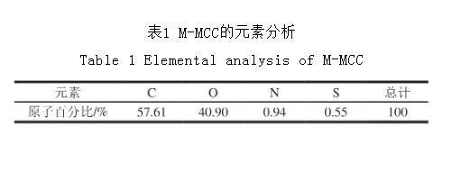 如图4C所示,M-MCC由于分子中N、S元素含量较少,全谱分析中并未能直接看到N元素(N1s)和S元素(S2p)的结合峰。M-MCC的C1s结合能为286.11 eV,O1s结合能为532.5 eV。进一步对N1s和S2p的特征谱峰进行精细扫描分析,由峰形可以判断出N、S元素的存在,但其较小的峰面积和峰强度也证实了N、S元素在M-MCC中含量较低。M-MCC的原子百分比如表1所示。由XPS所得到的N、S元素在M-MCC上的原子百分比仅为0.94%和0.55%,而C、O元素原子百分比则高达57.61%和40.91%。
