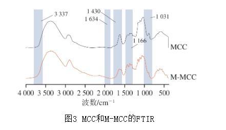 使用FTIR对改性前的MCC和改性后的M-MCC表面官能团进行表征,结果如图3所示。在3 337、1 634、1 430、1 320、1 166 cm-1和1 031 cm-1处MCC和M-MCC具有相同的峰,分别对应—OH拉伸振动峰、—OH弯曲振动吸收峰、—H—C—H—面内弯曲振动峰、—O—C—H面内弯曲振动峰、—C—O—C—不对称拉伸振动峰和—C—O—拉伸振动峰,这证明改性后MCC骨架结构不变,说明L-Met的接枝并没有破坏纤维素的基本骨架结构?!狢—S—C—的红外吸收峰出现在1 024 cm-1处,1 630~1 680 cm-1碳氧伸缩振动和1 460~1 550 cm-1氮氢弯曲振动证明了酰胺键的存在,间接证明了L-Met成功接枝到MCC表面。