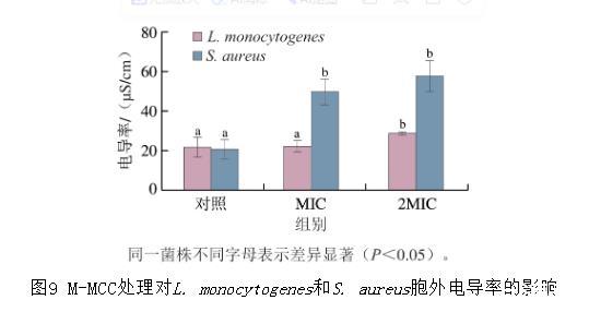图9 M-MCC处理对L.monocytogenes和S.aureus胞外电导率的影响