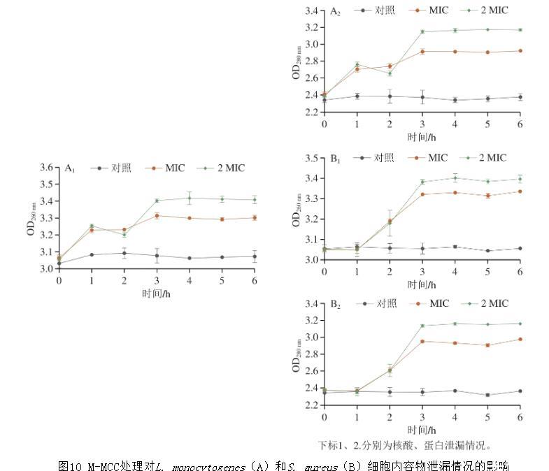 图10 M-MCC处理对L.monocytogenes(A)和S.aureus(B)细胞内容物泄漏情况的影响
