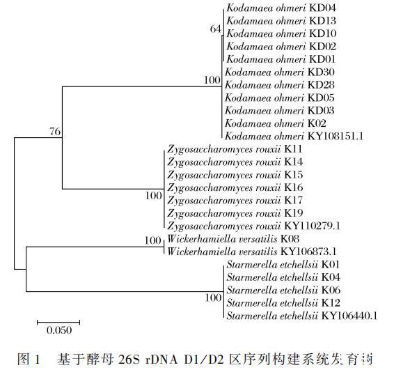 由于柯达酵母属在酱油发酵的3~4月占比最高,因此选择发酵3~4月的高盐稀态酱醪醪采样,一共分离得到21株纯培养酵母菌株,其形态特征及豆芽汁发酵液嗅闻结果如表1所示。21株酵母的豆芽汁发酵液具有花果香、酒香、醇香等香气特征。对所分离的生香酵母进行26S rDNA D1/D2区测序并构建系统发育树。如图1所示,共获得4个种,分属4个属,柯达酵母数量最多(10株),且均为K.ohmeri,其余为鲁氏接合酵母(Zygosaccharomyces rouxii)(6株)、埃切假丝酵母(Starmerella etchellsii)(4株)、多变拟威克酵母(Wickerhamiella versatilis)(1株)。