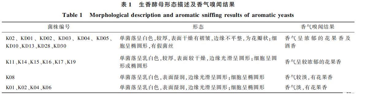 K02、KD01、KD02、KD03、KD04、KD05、KD10、KD13、KD28、KD30单菌落呈白色,较厚,表面干燥有褶皱,边缘不平整,为花瓣状;细胞呈椭圆形,有假菌丝香气呈浓郁的花果香及酒香
