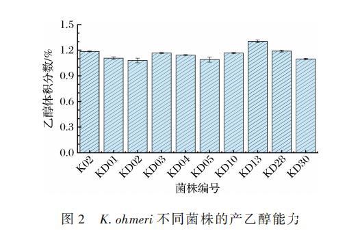 由图2可知,10株不同的K.ohmeri乙醇产量均大于1%(体积分数),KD13、KD28和K02产量较高,分别为1.30%、1.19%和1.19%。