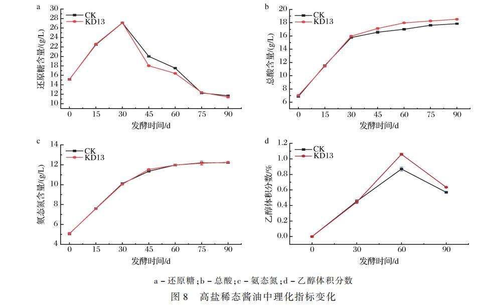 2.3.1酱油的4个重要理化指标:还原糖、总酸、氨态氮、乙醇含量变化如图8所示。酱油发酵过程中还原糖含量逐渐降低,总酸含量逐渐上升,氨态氮含量在发酵后期趋于稳定。添加KD13的酱油乙醇体积分数在发酵90 d时为2.34%,较对照组提升11.4%,表明KD13具有提升酱油乙醇含量的能力。