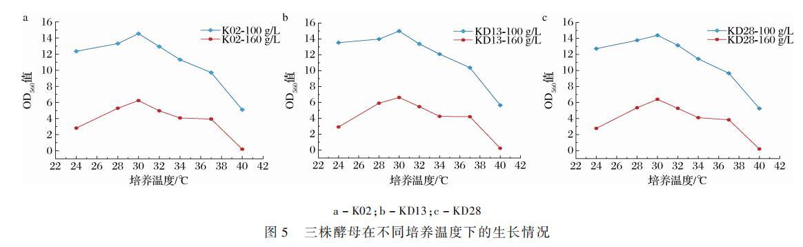 温度是微生物生长的重要影响因素之一,最适生长温度有利于获得更多的发酵菌株。对3株酵母在24~40℃的生长情况进行测定,结果如图5所示。3株菌在2种盐浓度下发酵液的OD???值随温度的升高呈现先升后降的趋势,30℃时OD值最大,因此30℃是3株菌的最适生长温度。温度升至40℃时,160 g/L盐质量浓度的条件下,3株菌发酵液OD???值接近0,表明酵母在该条件下几乎不生长。