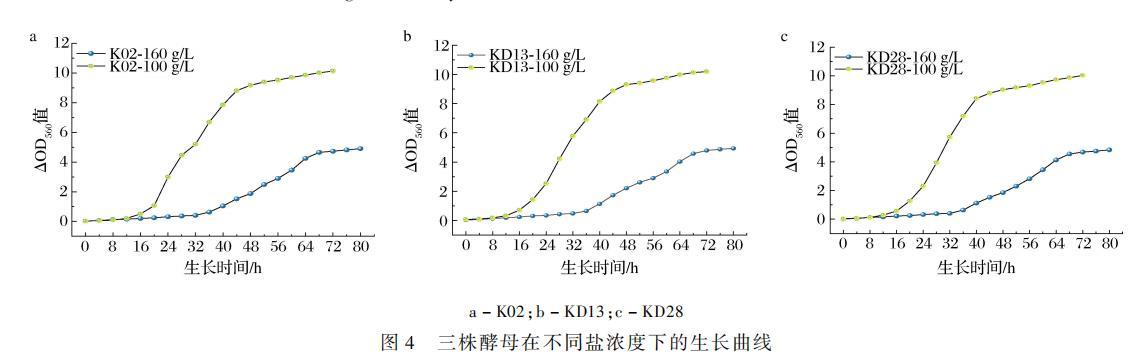 高盐稀态酱油发酵盐质量浓度一般≥160 g/L,而减盐发酵酱油的盐质量浓度则为100~120 g/L,为考察菌株在不同酱油生产中的生长特性,采取100 g/L和160 g/L盐质量浓度的豆芽汁培养3株K.ohmeri,结果如图4所示。3株菌在相同盐浓度下的生长曲线类似,100 g/L盐质量浓度下,3株菌对数期为16~44 h,44 h以后进入稳定期;而160 g/L盐质量浓度下,3株菌的对数期则延至36~64 h,64 h以后到达稳定期。160 g/L盐质量浓度下,3株酵母稳定期的ΔOD???的平均值为4.135,表明其在高盐环境下生长情况良好。