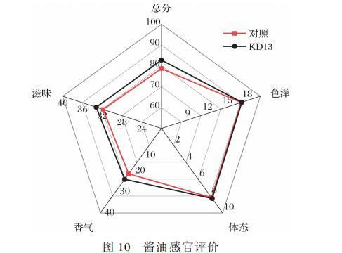 酱油的感官评价可以从色泽、体态、滋味、香气4个方面进行评估。对照组及KD13组酱油的感官评分结果如图10所示。2组酱油的色泽和体态评分较为接近,而KD13组滋味评分高于对照组,可能是由于酵母菌体在后酵后期发生自溶,产生呈鲜味的核酸类物质。另外KD13组的香气评分也高于对照组,这和2.3.2节的研究结果一致。感官评价结果表明,添加KD13对酱油色泽体态无负面影响,并且对酱油的滋味和香气有提升作用。