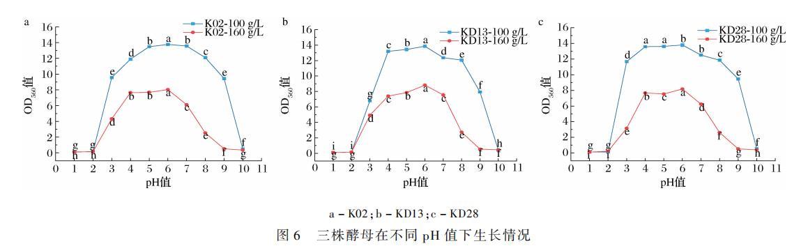 高盐稀态酱油酿造过程中,酱醪醪pH值一般为4~6。采用初始pH值为1~10的培养基对3株酵母生长情况进行测定,结果如图6所示。100 g/L盐质量浓度下,pH值为3~9时,3株酵母都有一定的生长能力;pH值为4~6时,生长能力最好;而在pH值为1~2及10的条件下不可生长。160 g/L盐质量浓度下,3株酵母在相同pH值条件下的OD???值均低于100 g/L盐质量浓度,pH值为3~8时都有一定生长,其中pH值为4~6时,生长能力最好,pH值为1~2及9~10的条件下不可生长。