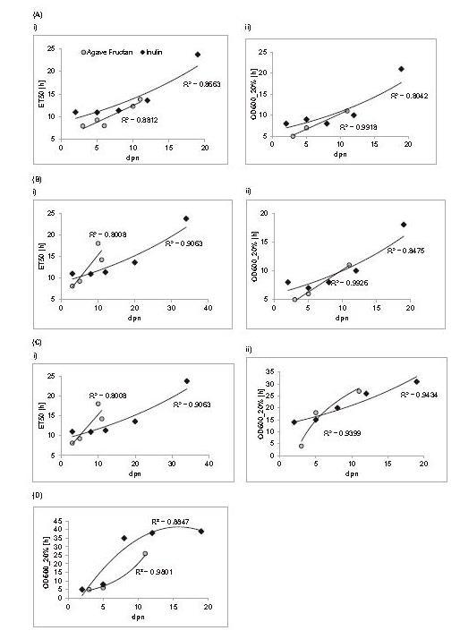 图4。聚合度(dp n)与生长促进的相关性:(A)嗜酸乳杆菌,(B)副干酪乳杆菌。副干酪乳杆菌CRL431,(C)鼠李糖乳杆菌GG和(D)副干酪乳杆菌ssp和副干酪乳杆菌DSM 20312(i)聚合度(dp n)和ET 50的相关性;(ii)果糖存在下dp n与最大OD 600值增加20%的时间相关性。灰色圆圈代表龙舌兰果聚糖,黑色菱形代表菊粉果类型的果聚糖。
