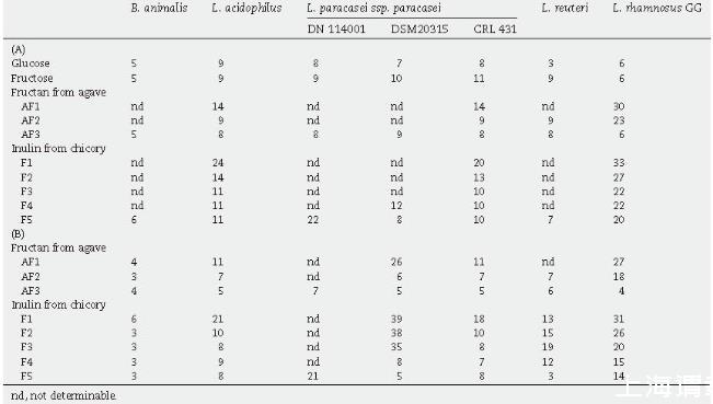 实验结果:菊苣菊酯型果聚糖和龙舌兰混合果聚糖对7个益生菌菌株的浊度测定和对其在琼脂板上培养确证显示出明显的益生作用。较低聚合度和/或明显分支特性的果聚糖增加了益生菌的生长。这也说明确定生长诱导的动力学很重要,因为低和高聚合度(dp)的果聚糖组合可能更适用于快速诱导益生菌的生长,但是要持续到远端结肠区域。菊粉型直链果聚糖通常在细胞外裂解为单糖或双糖在发酵之前,混合型果聚糖被一些益生菌吸收并在细胞内裂解。细胞内裂解是优选的,因为只有相应的益生菌才可以使用果聚糖源。在细胞外切割的情况下,形成的单糖和二糖也可以被其他菌株使用。