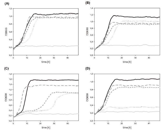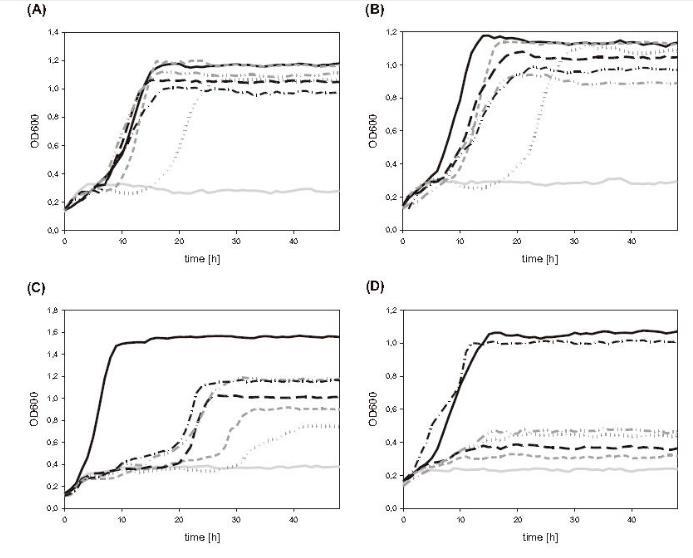图2、(A)副干酪乳杆菌ssp和副干酪乳杆菌CRL431,(B)嗜酸乳杆菌,(C)鼠李糖乳杆菌GG,(D)罗伊氏乳杆菌,(E)副干酪乳杆菌ssp和副干酪乳杆菌DSM 20312,(F)动物双歧杆菌,和(G)副干酪乳杆菌亚种和副干酪DN114001在没有糖(对照),0.5%的存在果糖和0.5%从具有不同的聚合度菊粉中的生长曲线。从图中可以看出,在所有5种菊粉组分的存在下,嗜酸乳杆菌生长良好。而鼠李糖乳杆菌GG可以使用所有菊粉,但是菊粉来源的使用高度依赖于dp。