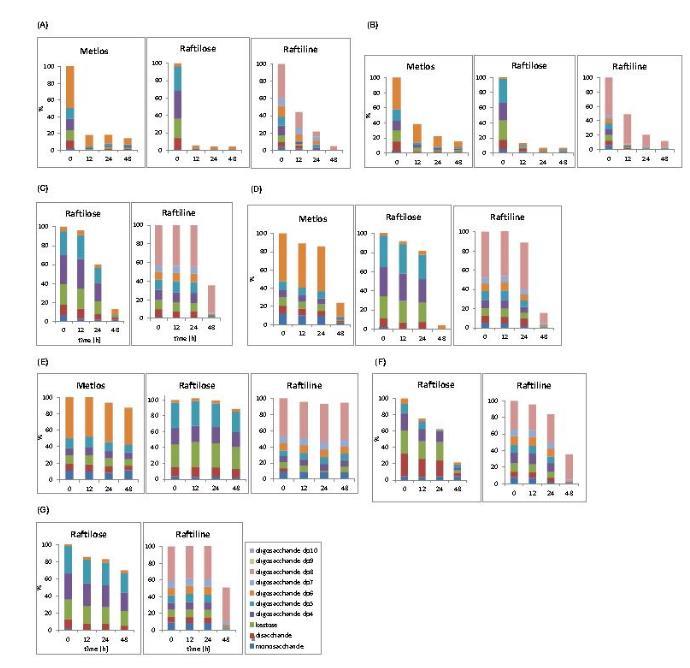 图5、益生菌对低聚果糖的降解可达dp(10)值:(A)副干酪乳杆菌ssp和副干酪乳杆菌CRL431,(B)嗜酸乳杆菌,(C)鼠李糖乳杆菌GG,(D)罗伊氏乳杆菌,(E)副干酪乳杆菌ssp。副干酪乳杆菌DSM 20312,(F)动物双歧杆菌,和(G)副干酪乳杆菌亚种和副干酪乳杆菌亚种DN114001。Raftiline®和Raftilose®可以确定所有降解模式。然而对于Metlos®,只有少数模式可以量化,而对于Metlin®,由于分支结构,样品根本无法量化。