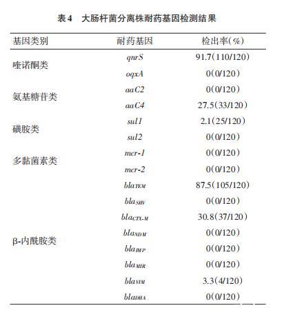 120株大肠杆菌分离株的耐药基因检测统计结果如下: