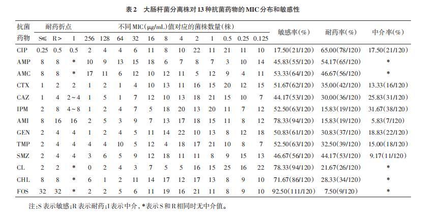120株大肠杆菌分离株对13种抗菌药物的药敏试验结果如下: