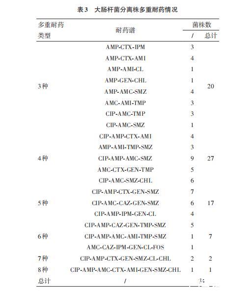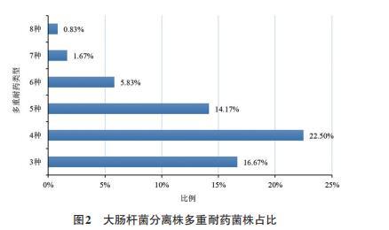 通过对大肠杆菌分离株的多重耐药情况分析发现,共有74株(占分离株61.67%)对3种及以上抗菌药物耐药,最多可以对8种抗菌药物耐药,其中对4种抗菌药物耐药的菌株数量最多,有27株(占分离株22.50%)。多重耐药结果基于表3内容总结如下: