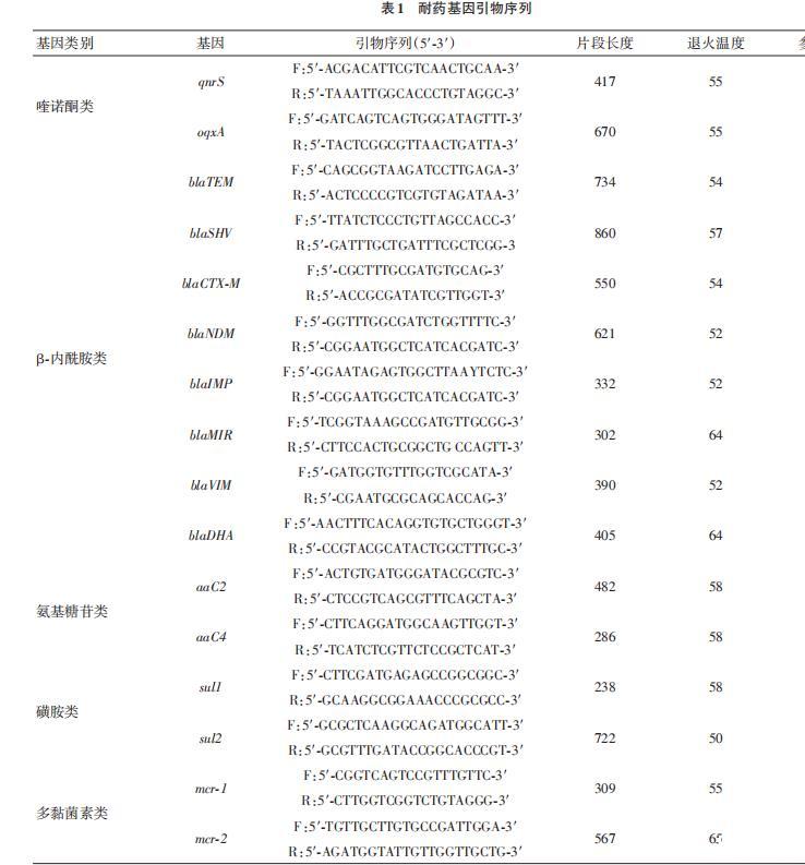 ?mcr-1:F:5'-CGGTCAGTCCGTTTGTTC-3',R:5'-CTTGGTCGGTCTGTAGGG-3',片段长度309 bp,退火温度55℃