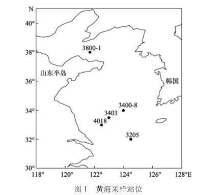 冷冻和冷藏对比实验选取2007年7月采集自黄海的编号为3205(32°N,124.5°E)、3403(33.5°N,123°E)、4018(33°N,122.5°E)三个站位的0~2 cm分层样品;保存时间实验选取2008年开放共享航次编号为3400-8(34°N,124°E)、3800-1(38°N,121.7°E)两个站位的0~2 cm、2~5 cm分层的样品(图1)。沉积物粒度分析采用Cilas(940L)型激光粒度仪进行测定。其他环境资料来自温盐深测定仪(CTD)现场测定。
