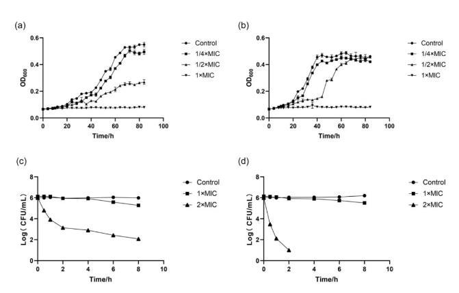 苯氧乙醇处理后痤疮丙酸杆菌CCSM0331(a)和痤疮丙酸杆菌ATCC6919(b)的生长曲线。苯氧乙醇处理后,痤疮丙酸杆菌CCSM0331(c)和痤疮丙酸杆菌ATCC6919(d)的时间杀菌曲线