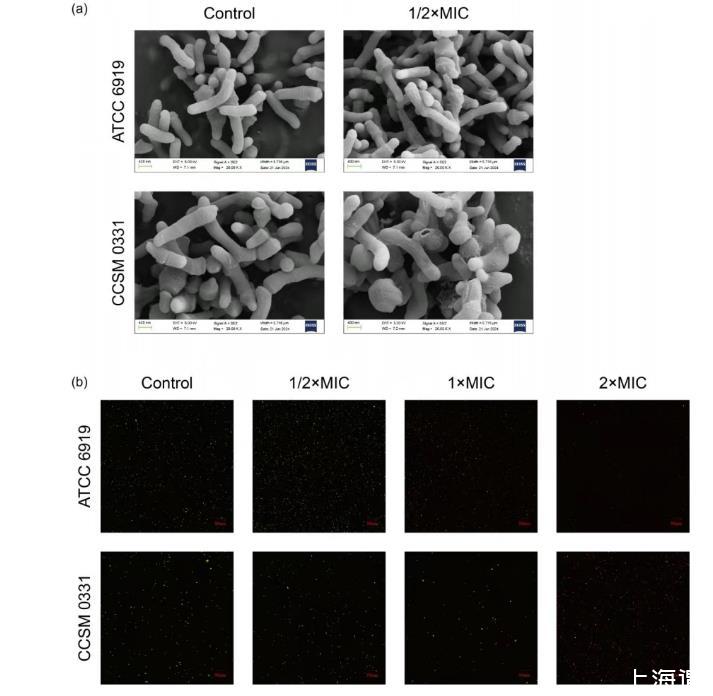 (a)暴露于0,1/2×MIC苯氧乙醇的痤疮丙酸杆菌ATCC6919和痤疮丙酸杆菌CCSM0331细胞的代表性SEM图像。(b)将痤疮丙酸杆菌ATCC6919和痤疮丙酸杆菌CCSM0331细胞以0、1/2×MIC、1×MIC或2×MIC暴露于苯氧乙醇2 h的激光扫描共聚焦图像