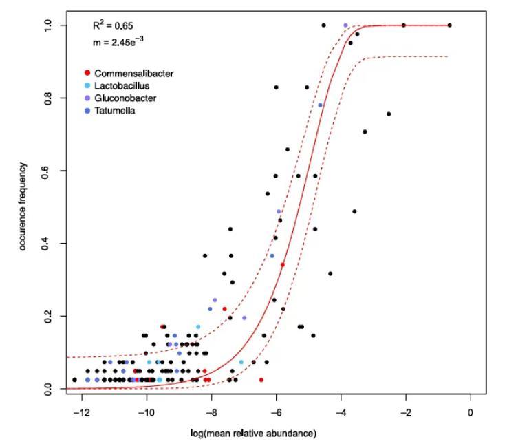 此外,Commensalibacter的不同ASV在中性模型中出现了三种模式:有些高于预期(说明受到宿主选择),有些与模型预测一致,还有少数低于预期(可能受到排斥)。这表明即使在同一属中,不同菌株可能也具备不同的定殖策略。
