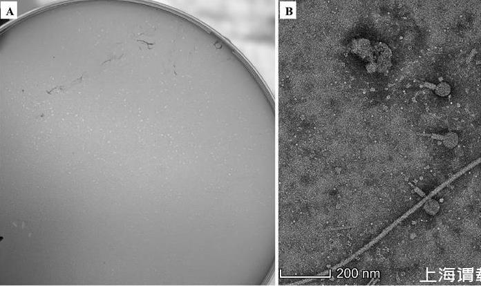 A.P1-CTX噬菌斑;B.透射电子显微镜下P1-CTX噬菌体形态