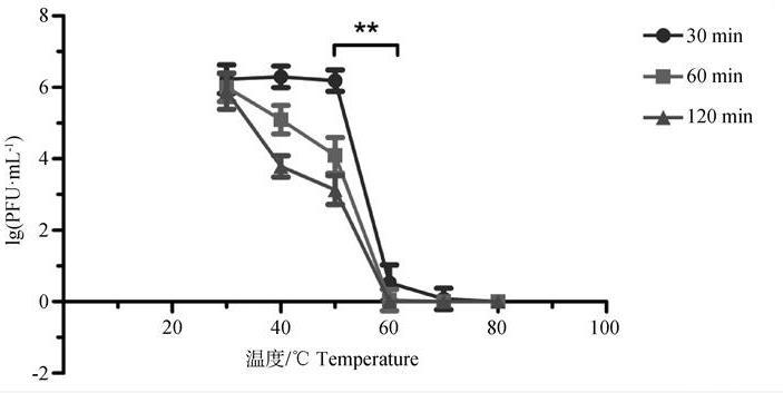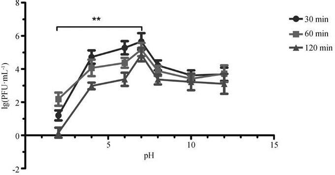 不同酸碱条件下噬菌体的效价如图5,噬菌体最佳pH为7,在pH 4~7和7~12噬菌体效价有所降低,但并不明显。而当pH为2时,噬菌体效价显著降低。所有不同pH情况下,随着噬菌体孵育时间长达120 min时,噬菌体活力均有所降低。
