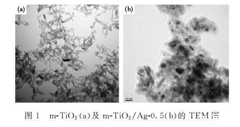 采用透射电子显微镜(TEM,JEM-2100型,日本电子株式会社)对样品的形貌进行表征;采用X射线衍射仪(XRD,XD-3A型,荷兰帕纳科公司)对样品的晶型进行检测;采用傅里叶变换红外光谱仪(FT-IR,Nicolet IR200型,美国PE公司)对样品化学结构进行测试,4000~500 cm?1;采用电感耦合等离子体原子发射光谱法(ICP-AES,PE-2100DV型,美国PE公司)测试m-TiO2/Ag中银含量。