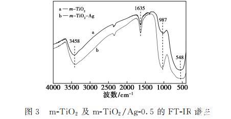 图3为m-TiO2及m-TiO2/Ag-0.5的FT-IR谱图。由图可知,500~800 cm?1处强吸收峰对应Ti-O伸缩振动峰,3458 cm?1处宽峰和1635 cm?1处吸收峰分别为催化剂表面吸附的水分子和羟基的伸缩振动峰和弯曲振动峰,两条曲线在987 cm?1处的吸收峰应该为Ti-O-Ti的伸缩振动。m-TiO2/Ag与m-TiO2的FT-IR在峰位上没有明显区别,表明用Ag修饰不影响m-TiO2的结构。