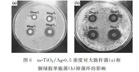 m-TiO?/Ag-0.5对大肠杆菌和铜绿假单胞菌抑菌环的影响见图6。由图可见,m-TiO?/Ag溶液在大肠杆菌平板和铜绿假单胞菌平板上均有明显抑菌环出现,浓度越高抑菌环越宽,抑菌效果越明显,银离子对前者的抑菌环要略小于后者,说明纳米银对铜绿假单胞菌具有更强的杀菌能力。