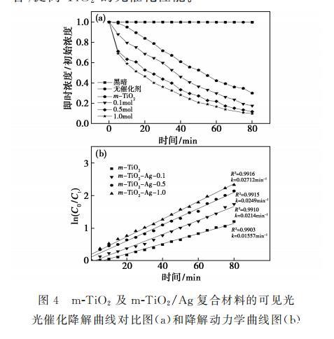 图4(b)为不同浓度m-TiO?及m-TiO?/Ag降解MB的动力学关系,实验发现不同样品ln(C?/C)与降解时间都有较好的线性关系。说明催化降解MB的反应为一级反应,其速率方程可表示为ln(C?/C)=kt,其中k为一级反应速率常数,t为反应时间,C?和C?分别代表反应时间为0和t时溶液的浓度。