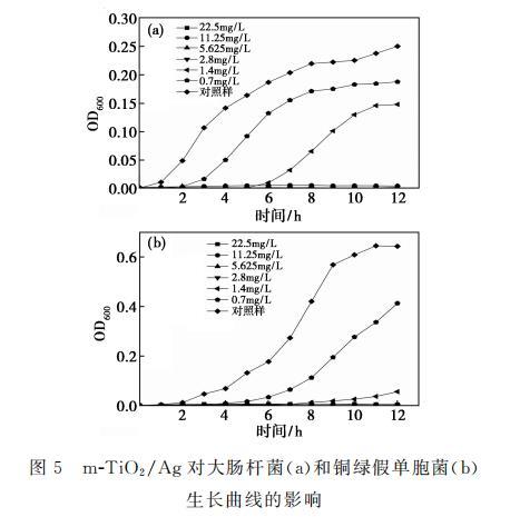 m-TiO?/Ag抗菌效果见图5。由图可知,大肠杆菌和铜绿假单胞菌在12 h内的生长曲线与培养液中纳米银的浓度呈显著负相关,银离子对两者的抑制作用均随着银含量的增加而逐渐增强。初始阶段,银离子的释放量较大,可快速高效杀灭细菌,当银离子释放达到平衡后,进入缓慢释放阶段,仍能维持长久的抗菌性。当培养液中没有银溶液存在时,所有菌种均呈现快速指数增长趋势。当培养液中添加了不同浓度的纳米银溶液,细菌生长相比空白对照样出现不同程度的延迟。