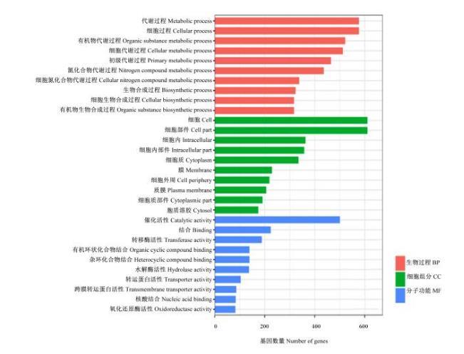 菌株GXUN13068-1在GO数据库分析中共有32 654个基因被注释(图9),其中属于生物学过程(biological process,BP)的有21 809个,占比66.79%;属于细胞组分(cellular component,CC)的有47 42个,占比14.52%;属于分子功能(molecular function,MF)的优6 103个,占比18.69%。在生物学过程中,与代谢相关的基因最多,包括代谢过程(577个基因)、细胞过程(577个基因)、有机物代谢过程(522个基因)等;在细胞组分中,主要与细胞(611个基因)、细胞部件(611个基因)、细胞内(363个基因)等有关;在分子功能上,主要与催化活性(501个基因)、结合(224个基因)、转移酶活性(188个基因)等有关。同时,还注释到抗逆性基因,如制孢调控(GO:0043937)、产孢(GO:0030435)等。上述结果表明,菌株GXUN13068-1具有较强的代谢能力及环境适应能力。