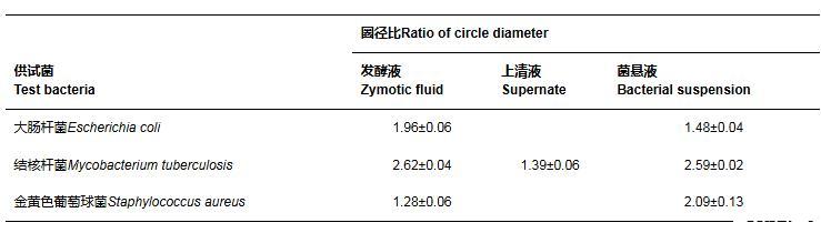 菌株GXUN13068-1体外抑菌试验结果见表5。菌株GXUN13068-1的发酵液、菌悬液对3种致病菌均具有抑菌活性,上清液只对结核杆菌具有抑菌活性,其中菌株GXUN13068-1发酵液对结核杆菌的抑制效果最为明显,圈径比高达2.6以上。从体外抑菌试验结果可看出菌悬液和发酵液对病原菌的抑制效果较上清液明显,由此可以判断出GXUN13068-1的抑菌作用主要依赖于菌体本身。