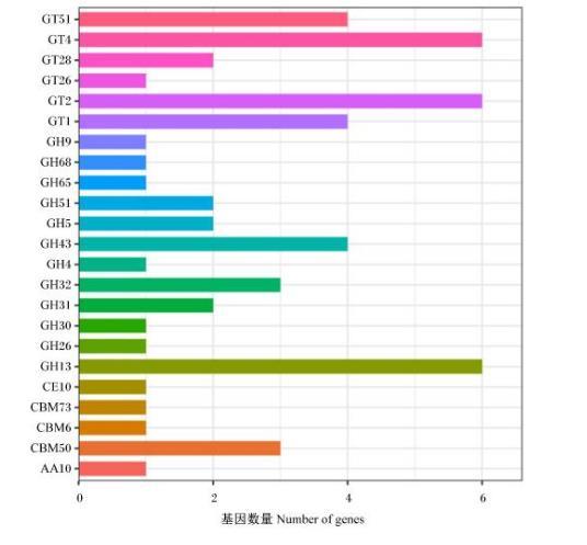 将菌株GXUN13068-1基因组与CAZy数据库进行比对,结果(图10)显示有55个基因被成功注释,其中最多的是糖苷水解酶(glycoside hydrolases,GH)基因(25个),随后依次为糖基转移酶(glycosyl transferases,GT)基因(23个)、碳水化合物结合模块(carbohydrate-binding modules,CBM)基因(5个)、碳水化合物酯酶(carbohydrate esterases,CE)基因(1个)和辅助氧化还原酶基因(auxiliary activities,AA)(1个)。在注释到的基因中,编码纤维素酶的基因(GH5家族)有2个,编码淀粉酶的基因(GH13家族)有6个,编码木聚糖酶的基因(GH43家族)有4个,编码糖基水解酶的基因(GH32家族)有3个。由此可知,菌株GXUN13068-1具有较强的碳水化合物水解能力。