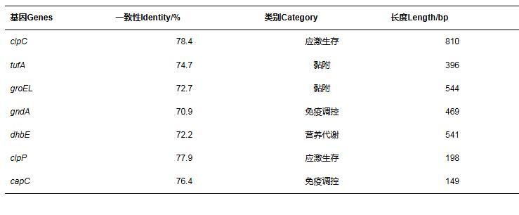 将菌株GXUN13068-1基因组与VFDB数据库进行比对,筛选一致性(identity)≥70%的基因,共找到7个毒力基因,如表6所示,其中2个基因与应激生存有关,2个基因与黏附有关,2个基因与免疫调控有关,1个基因与营养代谢因子有关,无可移动毒力基因,无致病性有关基因。