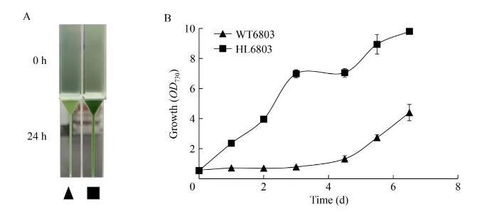 图1在高光900μmol/(m2·s)下高光6803与野生型6803培养1d的菌液比较(A)与生长曲线(B)HL6803:高光6803;WT6803:野生型6803;OD730:藻液在730 nm处测得的光密度。