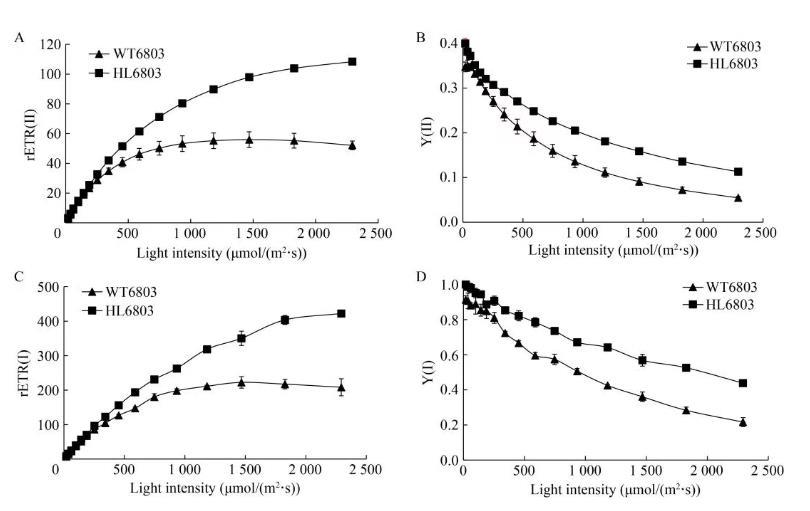 综上,通过对高光6803与野生型6803的rETR(II)、Y(II)、rETR(I)、Y(I)等光化学参数随光强变化的趋势比较分析,发现高光6803的rETR和Y数据(PSII与PSI)在中、高光强下均明显高于野生型6803,最大差距可超过1倍。这些结果说明在高光强下,高光6803具有更高的光化学活性与效率。