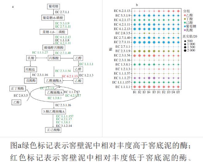 窖壁泥中参与酸代谢的酶类相对丰度显著高于窖底泥,并且具有相对丰度显著高于窖底泥的产酸细菌,比如Caproiciproducens、Lactobacillus、Syntrophaceticus等,推测窖壁泥富集的多种细菌群落,具有产生参与酸代谢酶类的特性,这些产酸细菌具有以乙醇或乳酸为底物合成丁酸己酸的潜力,能为白酒酿造代谢丰富的风味物质,例如乙酸、丁酸、己酸等。Lactobacillus在发酵过程中将糖类分解成乳酸,具有较强的代谢碳水化合物的产酸能力,乳酸可作为合成其他脂肪酸的底物,同时可以与乙醇通过酯化反应生成浓香型白酒独特风味的乳酸乙酯;Caproiciproducens是窖壁泥中的优势菌属,该类菌具有利用果糖、乳酸、半乳糖和木糖等为底物代谢乙酸、丁酸和己酸等短链脂肪酸的功能,主要是通过短链脂肪酸逆β-氧化代谢途径;窖壁泥中的Aminobacterium与铵态氮呈极强正相关,Aminobacterium不仅可以降解氨基酸生成乙酸和丁酸等,也可以降解氨基酸增加铵态氮的含量,这可能是窖壁泥铵态氮的含量高于窖底的原因。