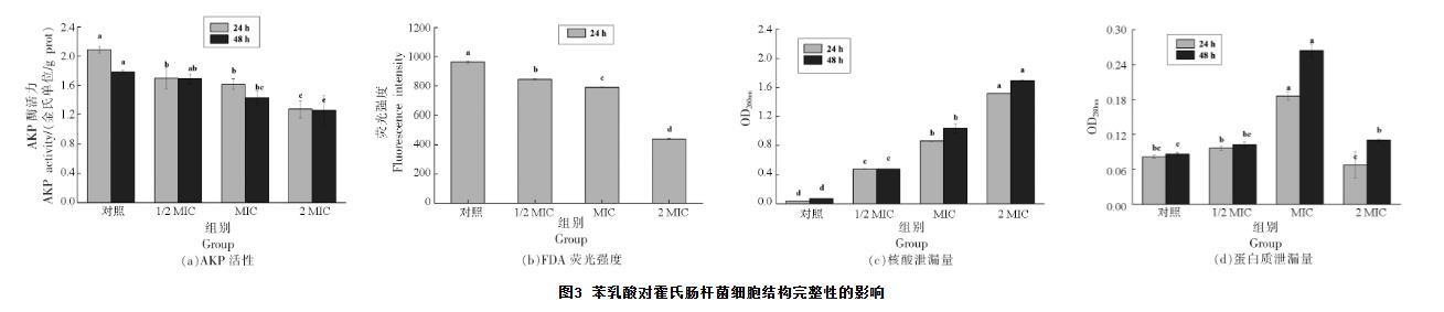 当细胞膜的完整性被破坏时,离子首先流出,然后是核酸和蛋白质等大分子物质。因此,通过测定在波长260 nm 与280 nm 波长处的吸光度来确定细胞中核酸与蛋白质等胞内物质的泄漏情况。由图3c 可知,在波长260 nm 处胞外吸光值随着苯乳酸处理质量浓度的增加而增加,且随着处理时间延长而增加。在48 h,经2 MIC 苯乳酸处理后的吸光度达到最高,约是处理组的1.6 倍,表明苯乳酸处理导致霍氏肠杆菌核酸的泄漏。由图3d 可知,MIC 苯乳酸组在波长280 nm 处的胞外吸光值显著高于对照组(P <0.05),且随着处理时间延长而显著增加,说明苯乳酸处理导致霍氏肠杆菌蛋白质的泄漏。值得注意的是,1/2 MIC 组吸光值与对照组相比差异不显著,而2 MIC 组吸光值呈现了下降的趋势,其原因可能是随着苯乳酸处理质量浓度的增加,溶液酸度升高,pH 值改变引起上清液中的部分蛋白质发生沉降而导致含量降低。结果表明,苯乳酸处理破坏了霍氏肠杆菌细胞膜完整性,导致核酸与蛋白质等物质的泄漏,从而影响细胞的正常生理活动。