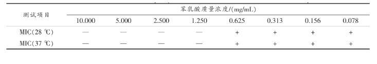 表1 不同温度下苯乳酸对霍氏肠杆菌的MIC 测定结果