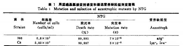 用250μg/mlNTG诱变1h,150μg/ml NY浓缩后检出精氨酸缺陷型菌株396(arg-)、赖氨酸缺陷型菌株和亮氨酸缺陷型菌株Cσ(lcu-)(表1)。
