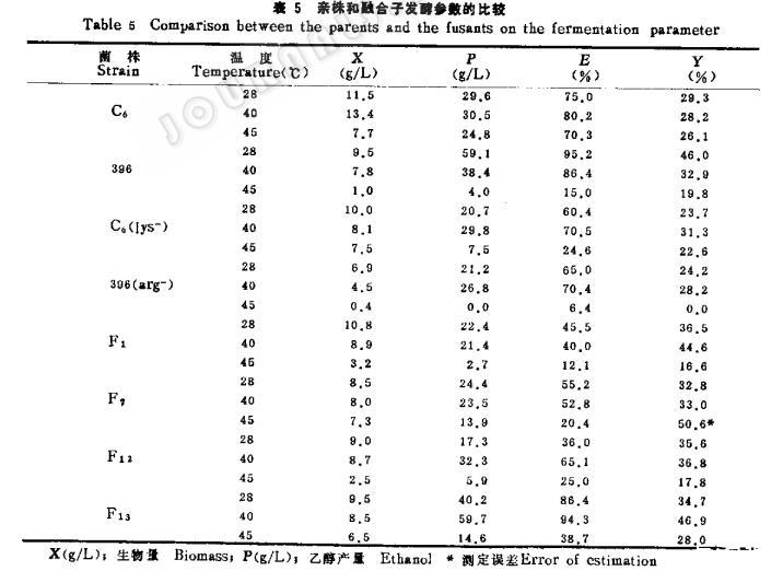 2.不同温度条件下基质消耗和乙醇产量的比较:各类型菌株在28℃、40℃和45℃培养条件下,利用甘蔗糖蜜发酵乙醇的各种参数(表5)表明,营养缺陷型菌株396(arg-)在不同温度下,乙醇的产率和基质的利用都比原出发亲株:396低,经过与耐热菌株C。(1s-)融合后得到的融合子,只有F13一株乙醇产率和基质利用率比较理想。在40℃和45℃下培养,乙醇产量均高于原生产菌株396。