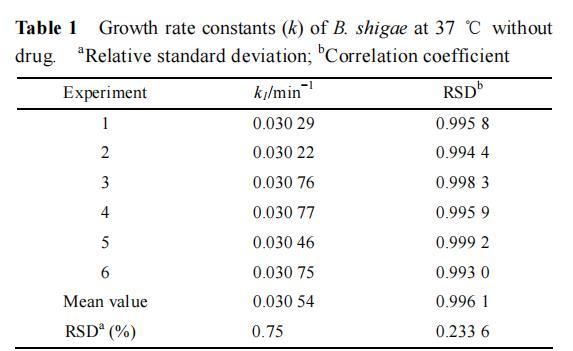 表 1 37℃ 下无药时志贺痢疾杆菌的生长速率常数 (k)